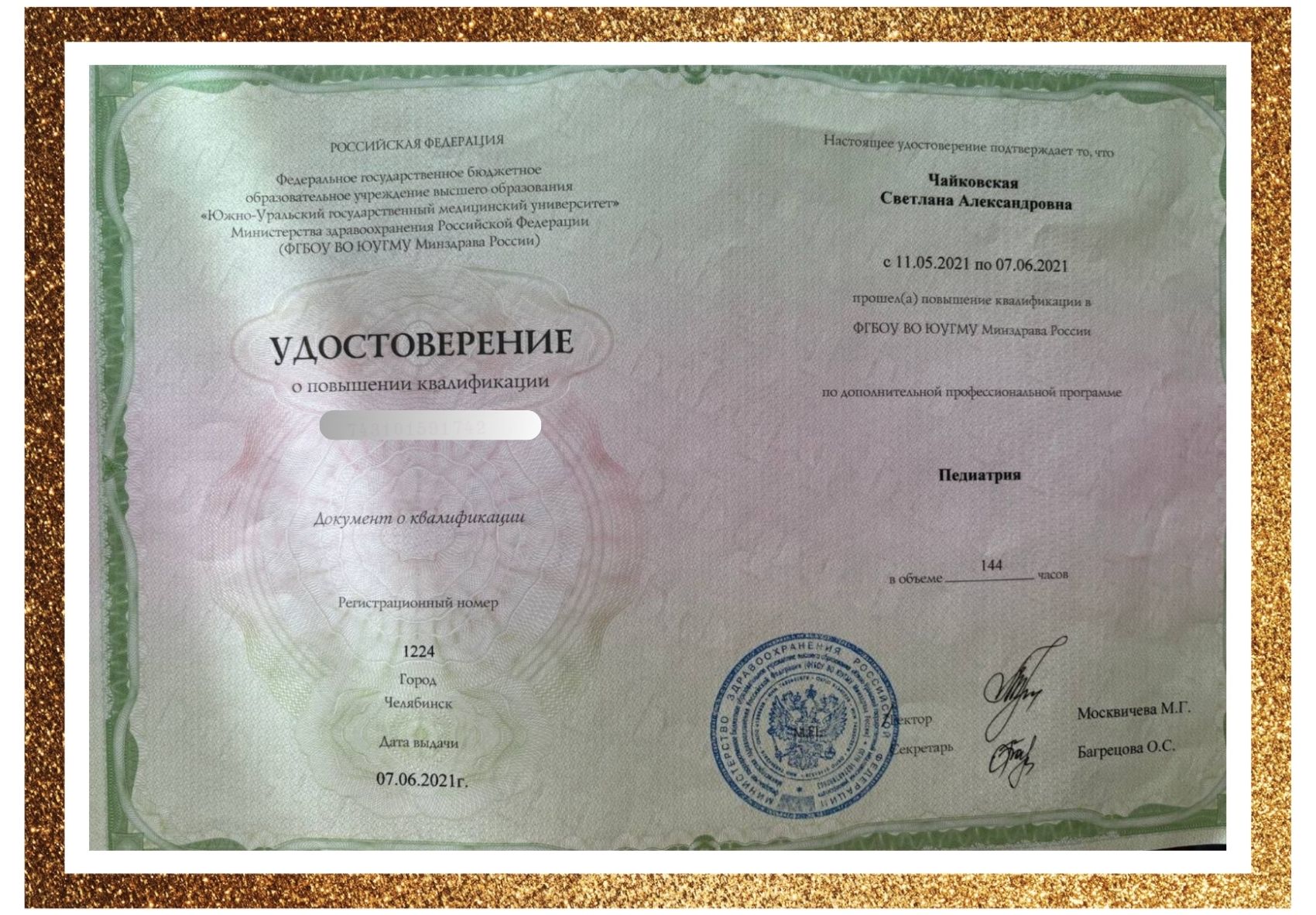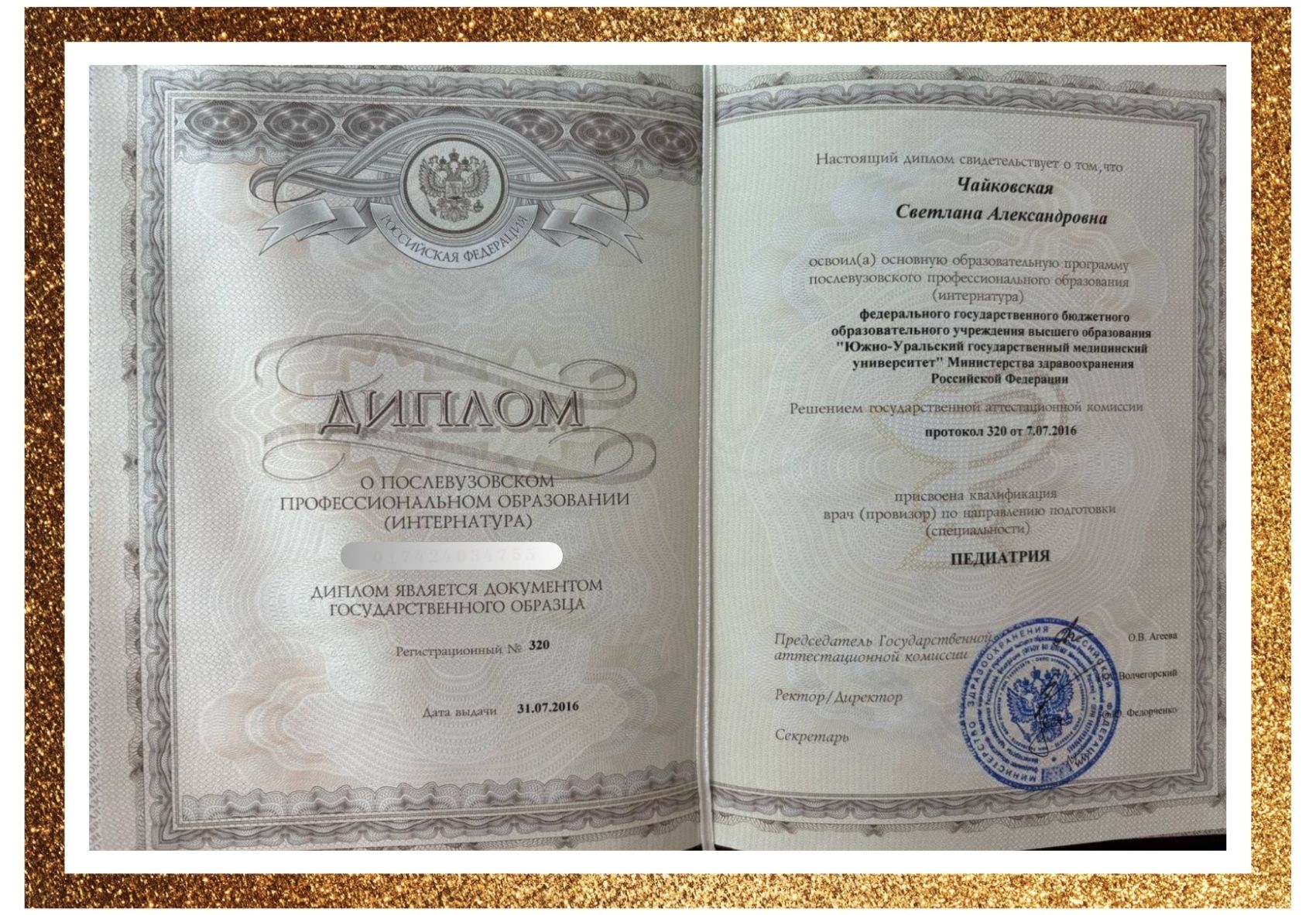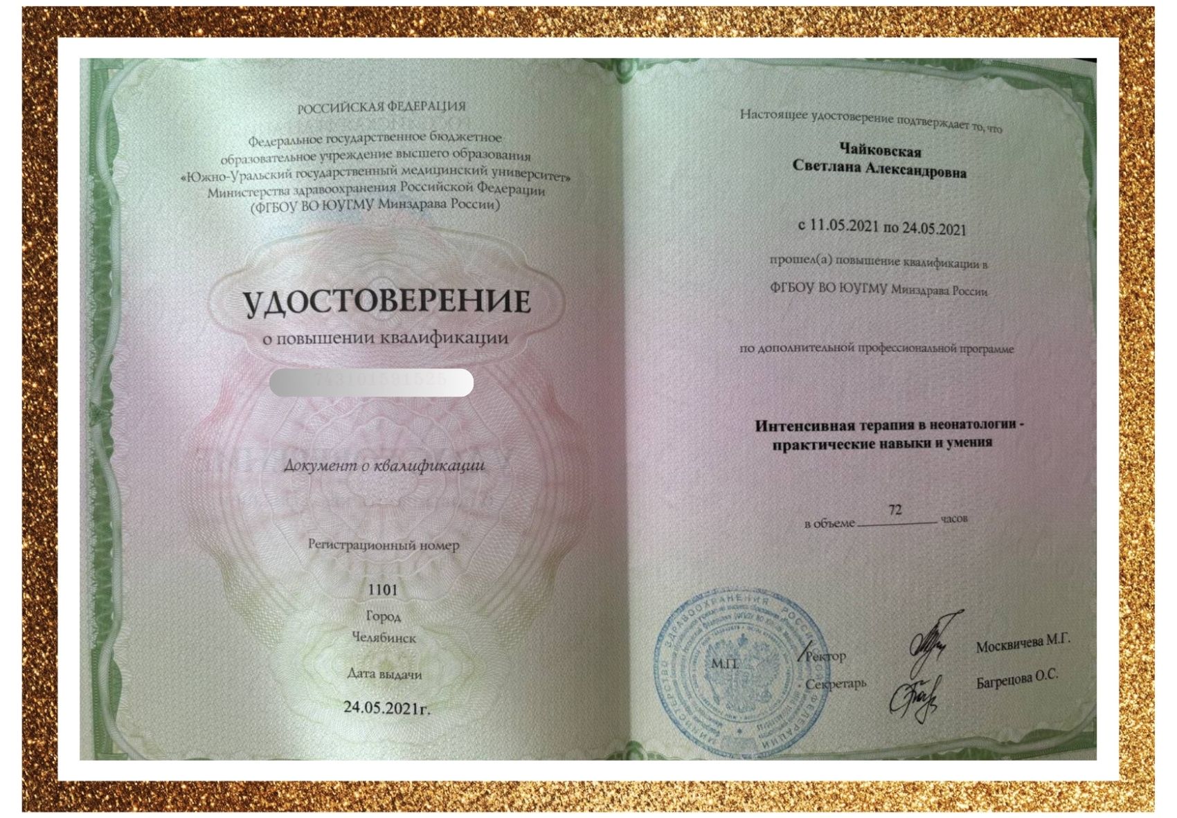 • В 2016 г. прошла интернатуру на кафедре пропедевтики детских болезней и педиатрии ФГБОУ ВО ЮУГМУ Минздрава России по специальности «Педиатрия».