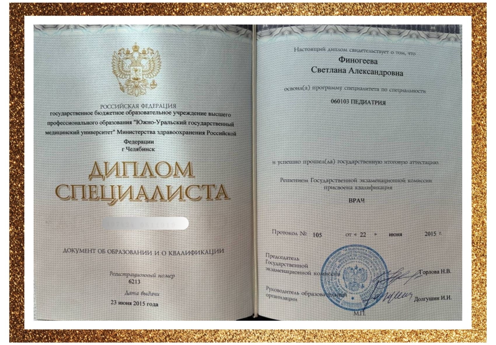 • В 2015 г. окончила педиатрический факультет ФГБОУ ВО «Южно-Уральский государственный медицинский университет» Министерства здравоохранения Российской Федерации. Присуждена квалификация врача по специальности «Педиатрия».